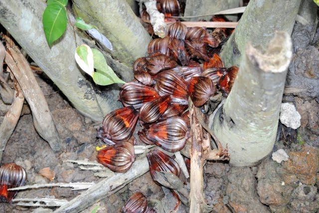 Ah ha! The knowledgeable and observant grandpa pointed out the fruit of what seems to be of the Nyireh tree (Xylocarpus sp.). It was located quite inside of the mangroves.