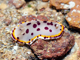 This nudibranch with purple dots and a yellow and purple fringe is affectionately known as the Cow nudibranch (Goniobranchus tumulifera). No prize for guessing why it's name as such.